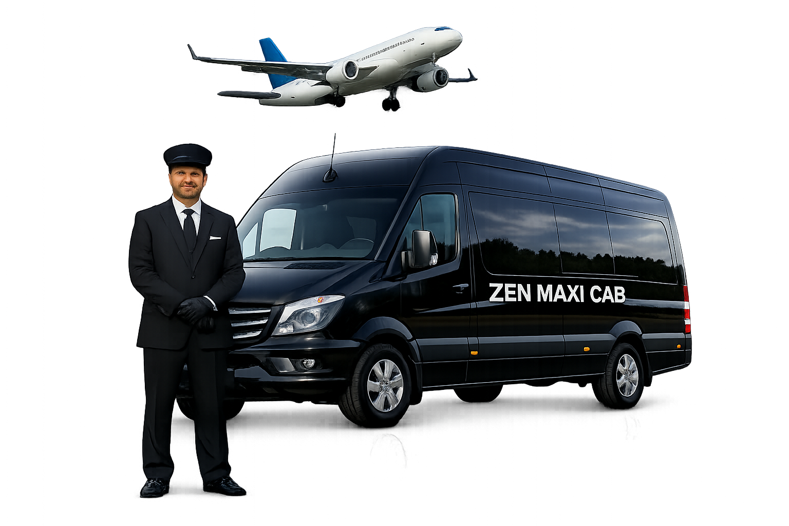 Zen Maxi Cabs offers dependable, pre-booked airport transfers with professional chauffeurs ready when you land.